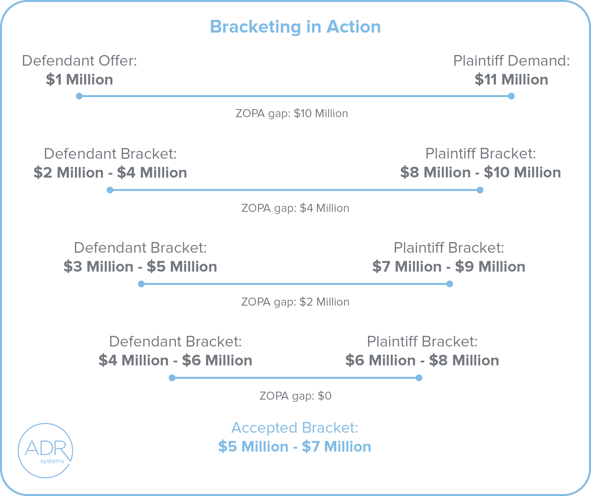 The image, titled “Bracketing in Action,” visually illustrates how negotiation brackets can narrow the settlement range between a defendant and plaintiff in mediation. At the top, the Defendant Offer starts at $1 million and the Plaintiff Demand at $11 million, creating a ZOPA gap of $10 million. The next rows show progressive brackets from each side, gradually narrowing the gap: Defendant Bracket: $2 million–$4 million vs. Plaintiff Bracket: $8 million–$10 million → ZOPA gap: $4 million Defendant Bracket: $3 million–$5 million vs. Plaintiff Bracket: $7 million–$9 million → ZOPA gap: $2 million Defendant Bracket: $4 million–$6 million vs. Plaintiff Bracket: $6 million–$8 million → ZOPA gap: $0 The Accepted Bracket is highlighted at the bottom as $5 million–$7 million, indicating the mutually agreeable settlement range. The diagram uses light blue lines to represent each negotiation range and shows the “ZOPA gap” (Zone of Possible Agreement) decreasing step by step until an overlap is achieved. The ADR Systems logo appears in the bottom left corner.