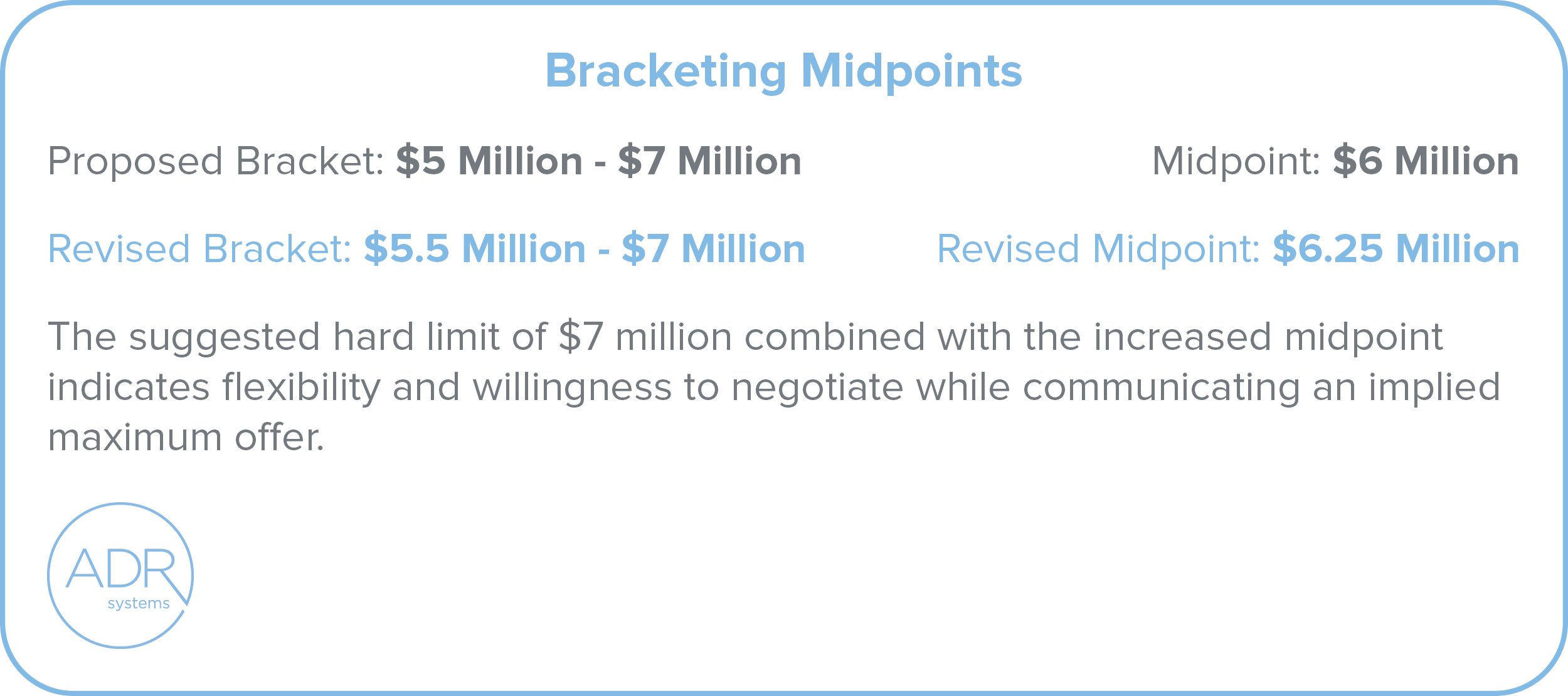 The image, titled “Bracketing Midpoints,” illustrates how adjustments to a negotiation bracket affect the midpoint and signal flexibility in mediation. The Proposed Bracket is shown as $5 million – $7 million, with a Midpoint of $6 million. The Revised Bracket is $5.5 million – $7 million, resulting in a Revised Midpoint of $6.25 million. A brief explanation below states: “The suggested hard limit of $7 million combined with the increased midpoint indicates flexibility and willingness to negotiate while communicating an implied maximum offer.” The layout uses blue and gray text for contrast and clarity, with key figures in bold. The ADR Systems logo appears in the lower left corner inside a rounded box with a light blue border.