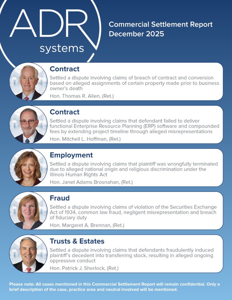ADR Systems has released its Commercial Settlement Report for December 2025, which features a sample of complex commercial cases settled by our mediators in the previous month. Review the report now.