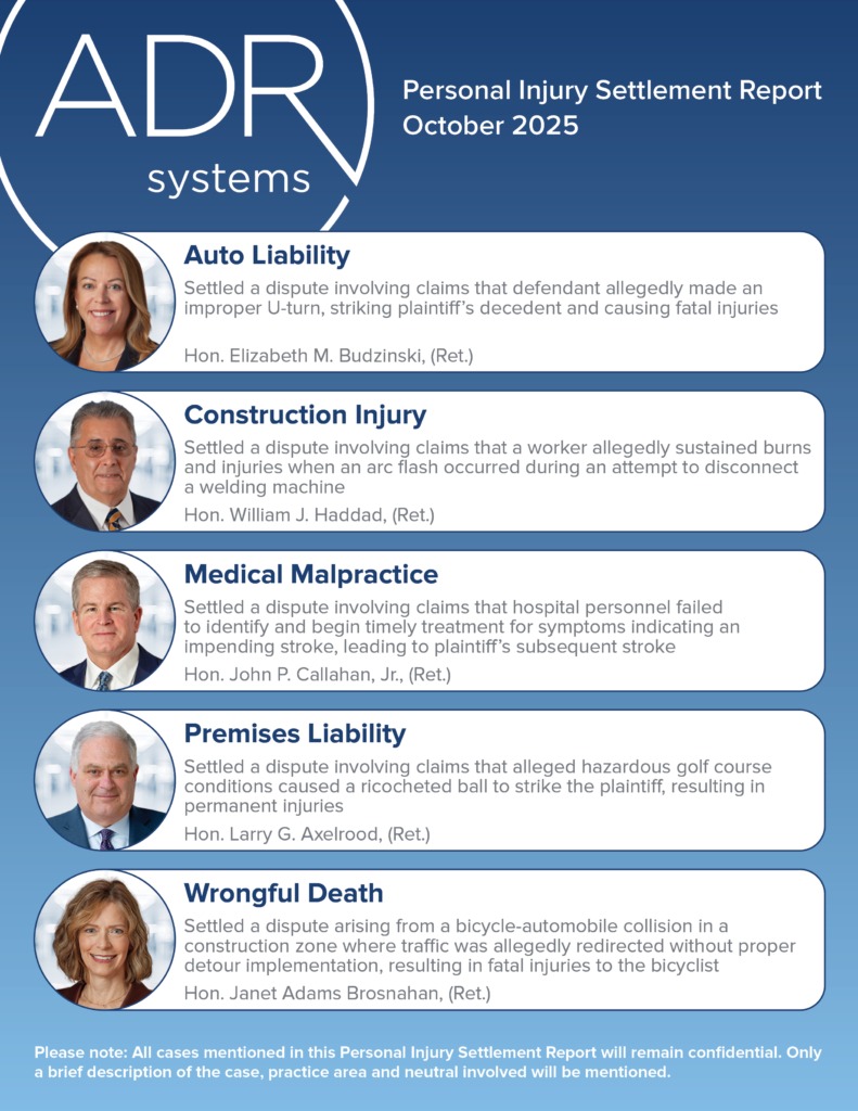 ADR Systems has released its Personal Injury Settlement Report for October 2025, which features a sample of unique personal injury cases settled by our mediators in the previous month. Review the report now.